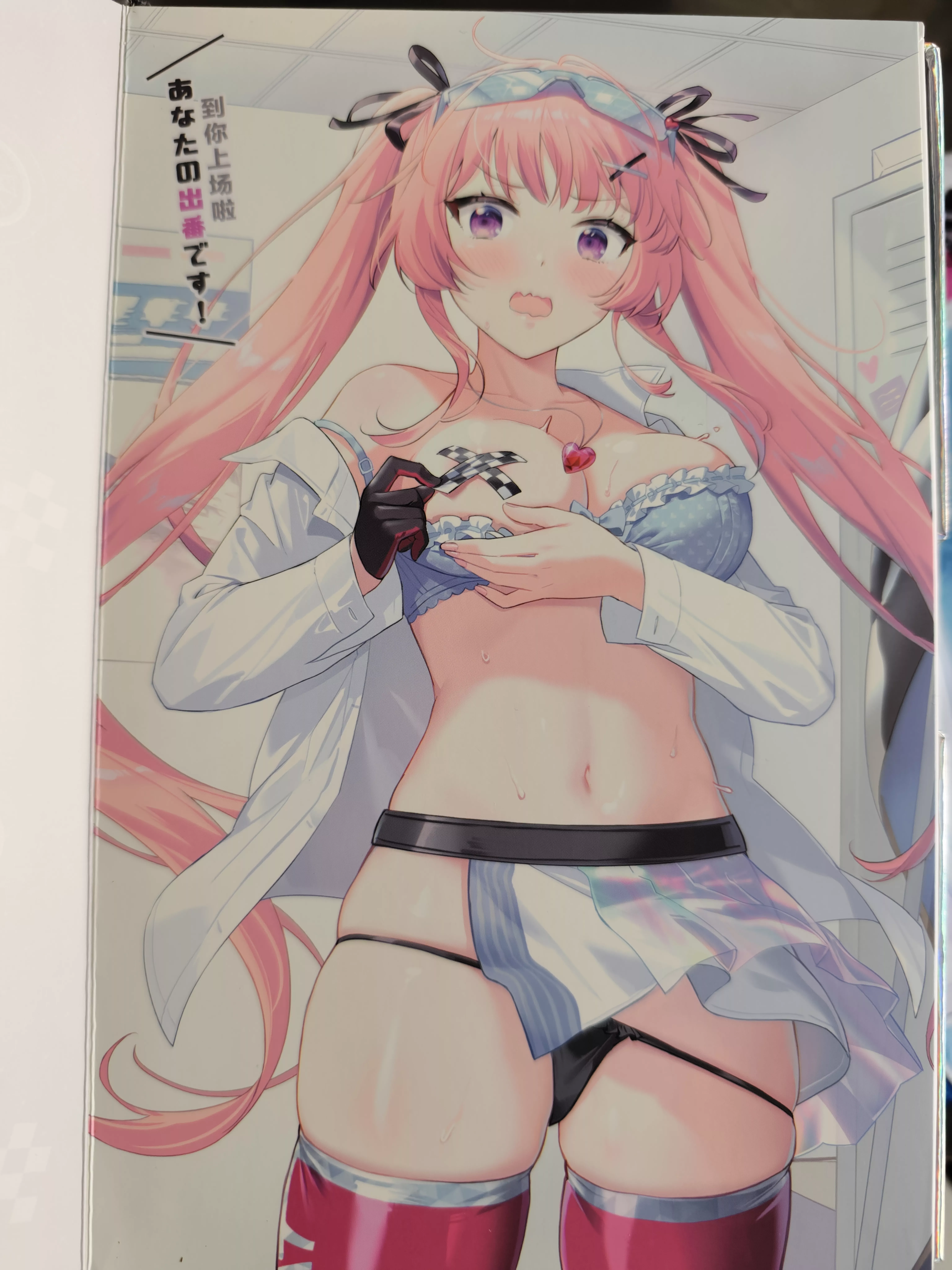 首先映入眼帘的是她的稍显羞涩的脸庞,此时的她正是和我们第一次在更衣室相遇的场景。她正在穿戴赛车服,由于我们突然的闯进,这时内衣不整齐的随意挂在身上。